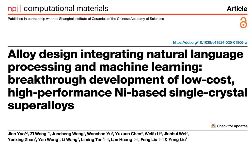 全国重点实验室高温合金研究团队在国际知名期刊npj Computational Materials上在线发表了题为“融合自然语言处理与机器学习的合金设计:低成本高性能镍基单晶高温合金的突破性开发(Alloy design integrating natural language processing and machine learning: breakthrough development of low-cost, high-performance Ni-based single-crystal superalloys)”的研究论文。