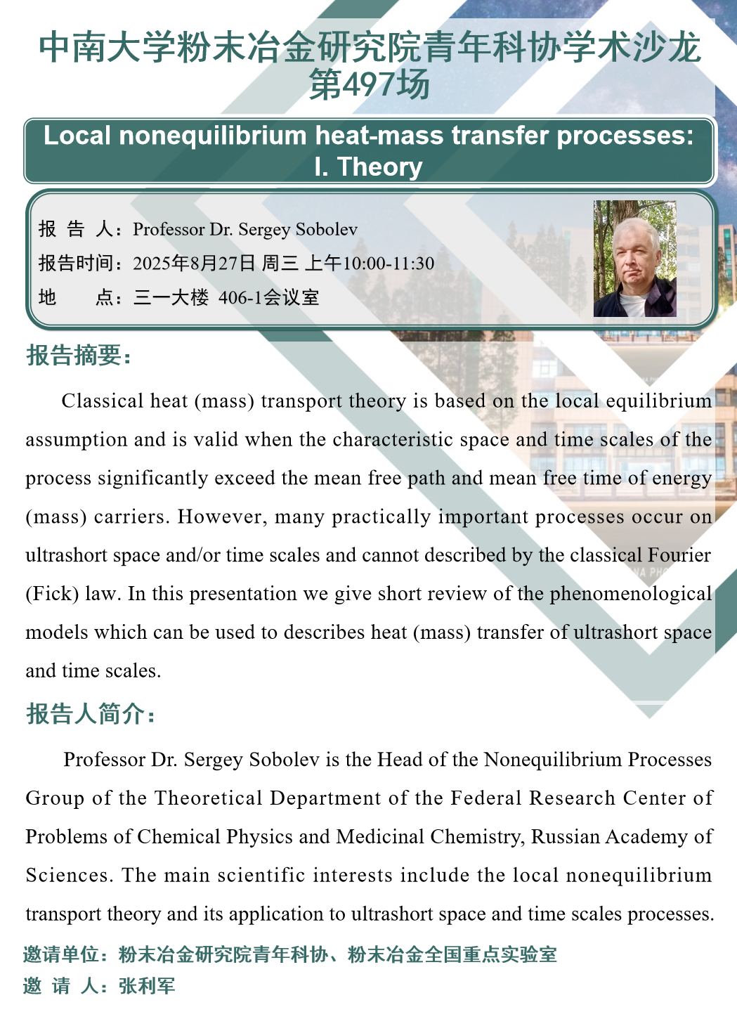 Professor Dr, Sergey Sobolev is the Head of the Nonequilibrium ProcessesGroup of the Theoretical Department of the Federal Research Center ofProblems of Chemical Physics and Medicinal Chemistry, Russian Academy ofSciences. The main scientific interests include the local nonequilibriumtransport theory and its application to ultrashort space and time scales processes.