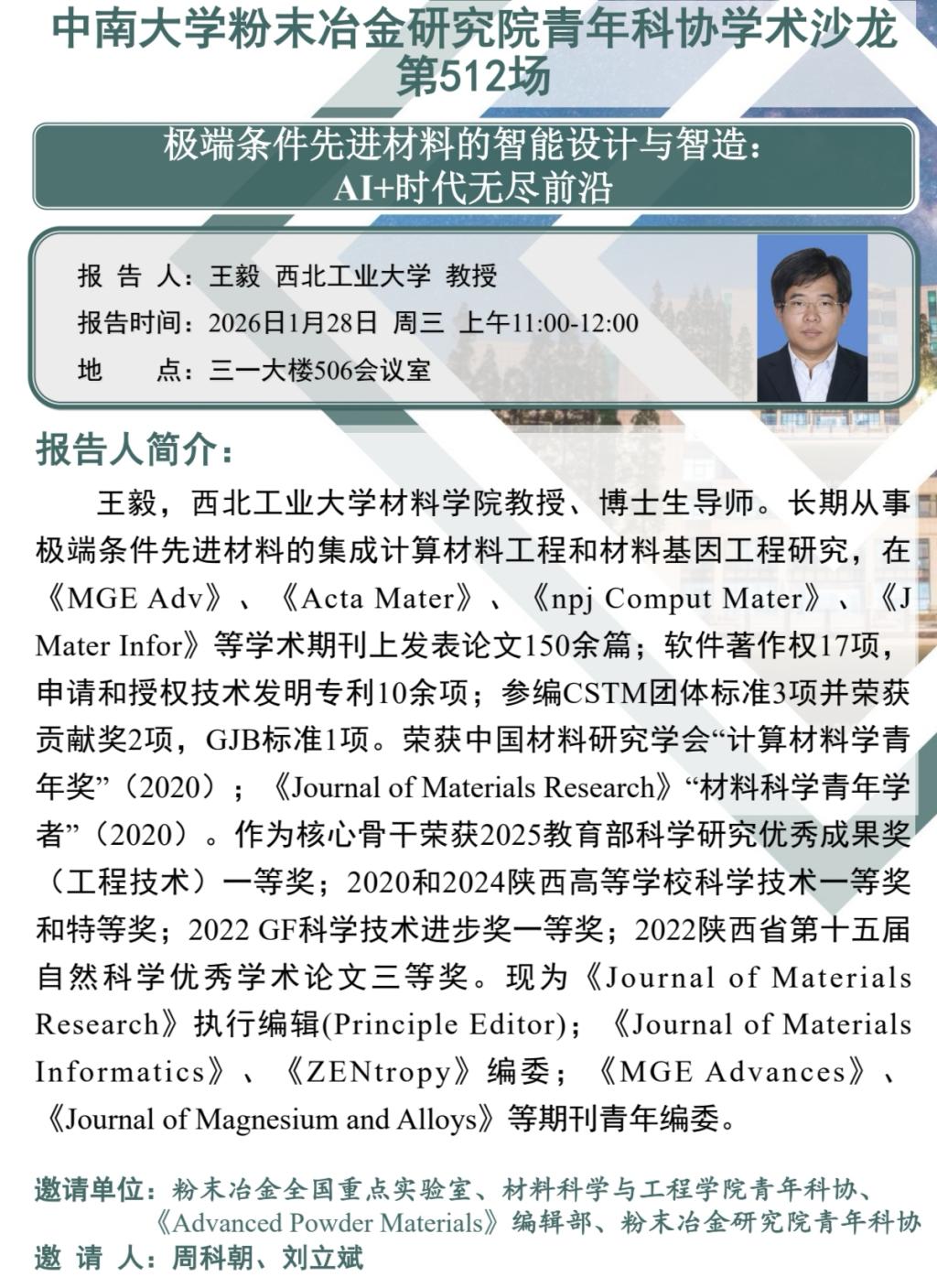 王毅,西北工业大学材料学院教授、博士生导师。长期从事极端条件先进材料的集成计算材料工程和材料基因工程研究,在《MGE Adv》、《Acta Mater》、《npi Comput Mater》、《JMater Infor》等学术期刊上发表论文150余篇;软件著作权17项,申请和授权技术发明专利10余项:参编CSTM团体标准3项并荣获贡献奖2项,GJB标准1项。荣获中国材料研究学会“计算材料学青《Journal of Materials Research》“材料科学青年学年奖”(2020);者”(2020)。作为核心骨干荣获2025教育部科学研究优秀成果奖(工程技术)一等奖;2020和2024陕西高等学校科学技术一等奖和特等奖;2022 GF科学技术进步奖一等奖;2022陕西省第十五届自然科学优秀学术论文三等奖。现为《JournalofMaterialsResearch》执行编辑(Principle Editor);《Journal of MaterialsInformatics》、《ZENtropy》编委;《MGE Adyances》《Journal of Magnesium and Alloys》等期刊青年编委。