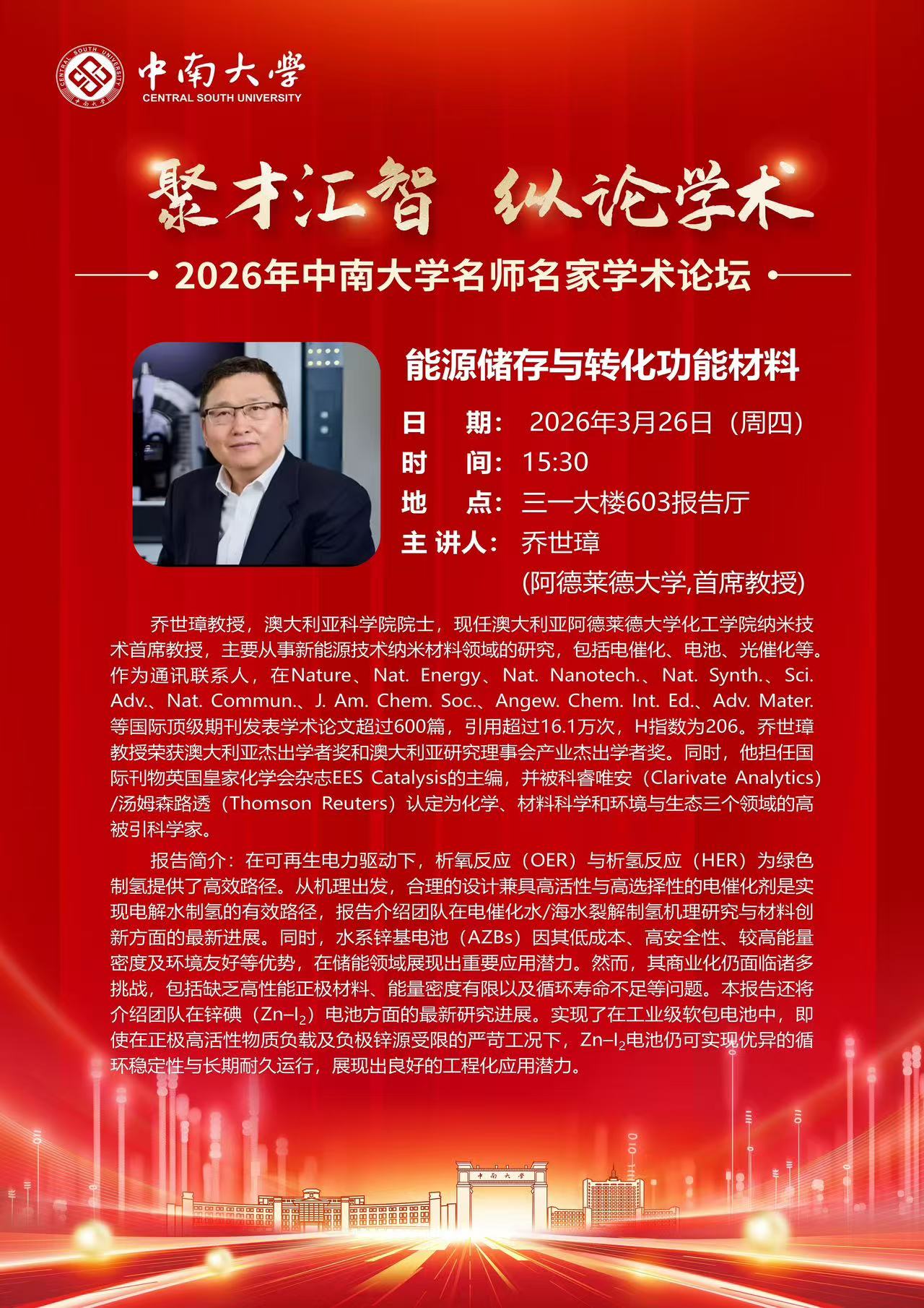 2026年皇冠博彩官网名师名家学术论坛——乔世璋(能源储存与转化功能材料)