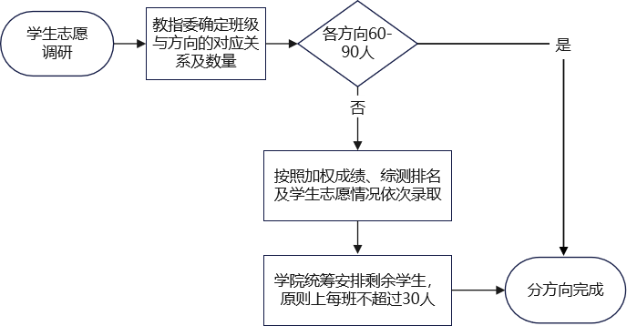 2. 第一志愿录取:各方向负责人组织相关教师,综合学生志愿及加权平均成绩进行审核,确定各方向初步录取名单。各方向在本轮录取的最大名额均不得超过90人。若所有方向第一志愿人数均在60-90人区间,录取工作结束。否则,进入后续调剂环节。
