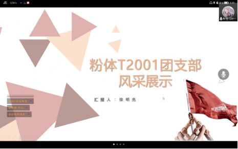 上半场粉体2003团支部、材化2002团支部、粉体T2001团支部、冶材2102团支部、冶材2103团支部五个支部为我们带来了精彩展示,各支部简要介绍了自己支部开展团日活动的情况以及对未来工作的规划。其中,粉体T2001班团支书对目前疫情期间如何在寝室营造良好的学习氛围做出了介绍,以寝室为单位,寝室长带动本寝室的同学主动学习。