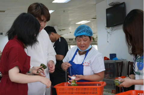 活动伊始,二食堂的阿姨们热情地为大家展示了粽子的几种包法。在阿姨们的现场教学结束后,同学们都迫不及待地开始动手尝试了起来。大家首先拿出事先准备好的粽叶,开始有模有样地折了起来;随后便是向粽叶内加入糯米和馅料。最后,在阿姨们的帮助下,同学们用绳子将粽子扎了起来。经过一个小时的努力,千奇百怪的粽子展现在我们面前,有方形的、菱形的,有豆沙馅的、五花肉的、咸蛋黄的等等。随即大家将粽子带去厨房开始了蒸制。