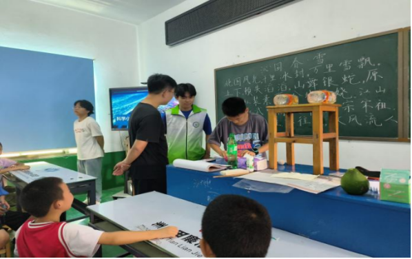 照亮乡村教育,激发热心青年。在书法课堂上,团队队员具体讲解字的笔画、结构,耐心指导每一位学生如何正确下笔书写,帮助他们养成良好的书写习惯,强调勤奋练习的重要性,给孩子们带来了不一样的书法体验。在音乐课堂上,团队队员讲授基础乐理知识,并向同学们介绍了吉他的来源和基本结构,最后队员们带领孩子一起放声高歌,激发孩子们对音乐的热爱和探索精神。