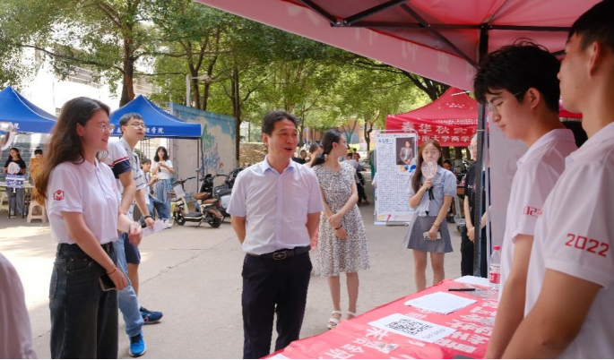 2023级新生报到现场看望新生及其家长,同时对负责新生报到工作的志愿者们进行慰问。