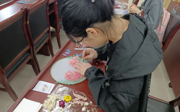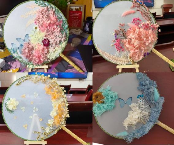 文艺坊充分考虑同学们的喜好,准备了各式各样的团扇模板,充分调动了同学们的积极性。活动中,同学们跟着视频里的步骤,仔细地挑选干花,小心翼翼地进行制作。在一朵又一朵的压花后,原本朴素的团扇慢慢呈现出精美,一个又一个鲜艳精致的团扇跃然掌心。