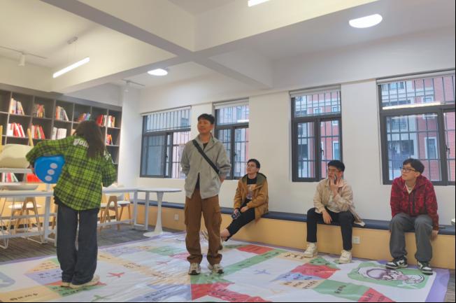 为进一步激发同学们对文学的喜爱,此次活动还在教室的地面上铺设了特制的“书香棋盘”。同学们兴致勃勃地走上铺设在地面的飞行棋盘。每个格子里都藏着一道文学类题目,涵盖诗歌、小说、名著等多个领域。在飞行棋互动环节,同学们笑声不断。每一次扔骰子,都伴随着期待与惊喜。有的同学回答问题得心应手,一路领先;有的同学运气不佳,但大家都在欢乐中前进,在游戏中分享“悦”读的感悟。