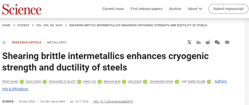 国家重点实验室王章维教授和宋旼教授合作,在国际学术期刊《Science》上在线发表了题为“Shearing brittle intermetallics enhances cryogenic strength and ductility of steels”的研究论文,中文题目为“剪切脆性金属间化合物提高钢的低温强度和塑性”。皇冠体育博彩