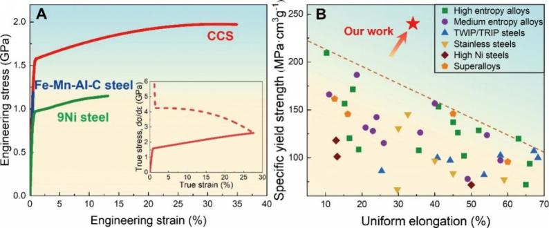 准静态单轴拉伸试验的工程应力应变曲线表明,在低温下,高熵钢具有超高的屈服强度1586 MPa和极限抗拉强度1976 MPa,同时还拥有高达34%的延伸率,克服了传统Fe-Mn-Al-C低密度钢中L’12型κ-碳化物强化引起的低温脆性问题。因此,凭借其超高的比强度和相对低廉的成本优势,高熵钢有望成为液化天然气(LNG)运输和储存的理想材料。