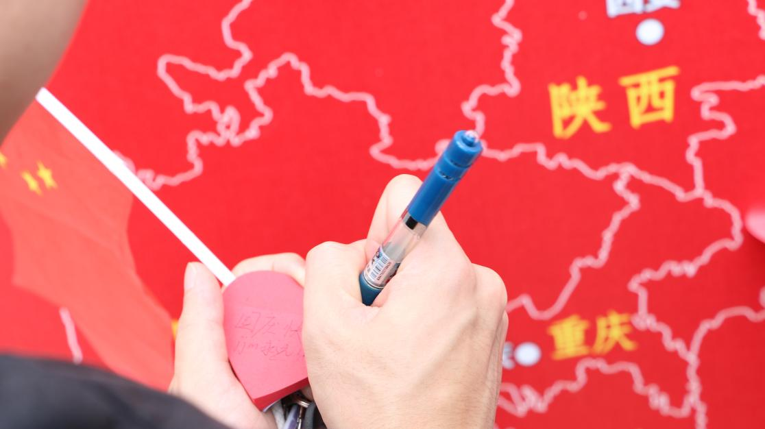 以“梦”告白,用“笔”献礼,大家用“青春告白祖国,书写强国梦想”的方式写下对祖国繁荣昌盛的美好祝愿,并将祝福语粘贴在地图上的家乡位置,向祖国告白,共同为祖国母亲庆生。