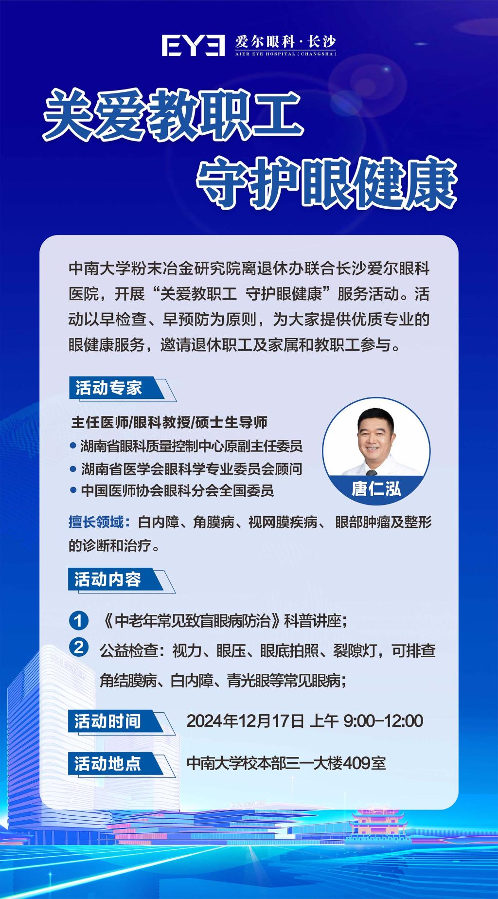 本次活动邀请湖南省眼科质量控制中心原副主任委员、湖南省医学会眼科学专业委员会顾问、中国医师协会眼科分会全国委员、长沙爱尔眼科医院白内障专科主任医师唐仁泓教授进行《中老年常见致盲眼病防治》科普讲座。从白内障的“迷雾成因”到青光眼的“眼压危机”,从黄斑病变的隐匿偷袭到糖尿病性眼病的关联隐患,深入浅出剖析病理,搭配生动案例,以最直白的方式传授防治要诀,为我院教职工、退休职工及其家属定制专属护眼指南。