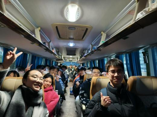 的考研学子们乘坐送考专车前往考场。随行的还有学生志愿者们。