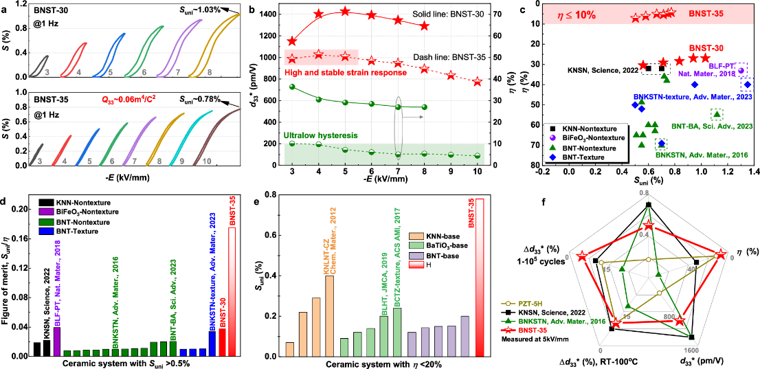 针对无铅陶瓷大应变与低迟滞性难以同时兼得的难题,该团队以遍历弛豫态的钛酸铋钠-钛酸锶陶瓷作为研究对象,基于其应变迟滞低、稳定性优异的本征优势,结合晶粒核壳结构和晶格缺陷结构调控打破其低应变和高驱动电场瓶颈。获得了低电场下(3~5kV/mm)大信号压电应变系数≥1000pm/V,且应变迟滞<10%。该低迟滞高应变还表现出近零的残余应变、良好的温度和循环稳定性。该工作于2024年8月发表在Nature communications(//doi.org/10.1038/s41467-024-51082-6)。