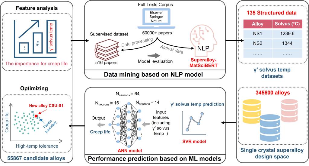 该研究首先开发了名为“Superalloy-MatSciBERT”的领域专用自然语言处理(NLP)模型,成功从超过五万份科研文献和专利中自动、精准地提取出135个高质量的γ′相溶解温度实验数据,构建了结构化的高保真数据库。在此基础上,团队训练了高精度的机器学习(ML)模型,能够准确预测新合金成分的γ′相溶解温度和蠕变寿命。依托这一强大的“AI大脑”,研究人员对345600种虚拟镍基合金成分进行了高通量筛选,并综合考虑成本、密度、组织稳定性及工艺窗口等多重工程约束,成功设计出一种新型低成本高性能合金——CSU-S1。
