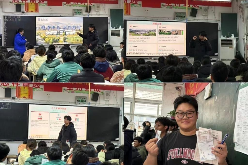 活动当天,团队负责人张鑫与成员黄子阳、段雨佳深入高三年级,围绕“硬核中南”“魅力中南”“相约中南”三个方面,系统讲解了皇冠博彩官网的历史底蕴、学科优势、师资力量及科研实力,展现了校园学习生活环境。同时,团队成员结合安徽省近年招生政策与录取数据,为在场学生提供了针对性的备考指导和报考建议。