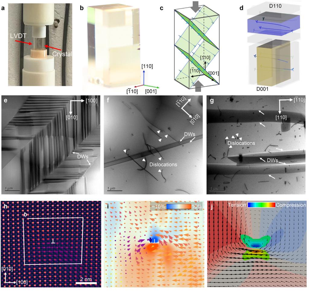 为本文的第一单位。该文提出一种基于缺陷工程的热释电性能调控策略,通过在刚性陶瓷单晶中引入特定取向的位错,实现了热释电性能的大幅提升。团队在高温条件下通过单轴压缩的方法,使刚性陶瓷单晶发生塑性形变,激活了钛酸钡的{100}<100>高温滑移系,成功引入特定取向的位错,通过改变晶体的切割面,系统研究了位错取向对应力场分布、极化分布和铁电畴结构的影响。