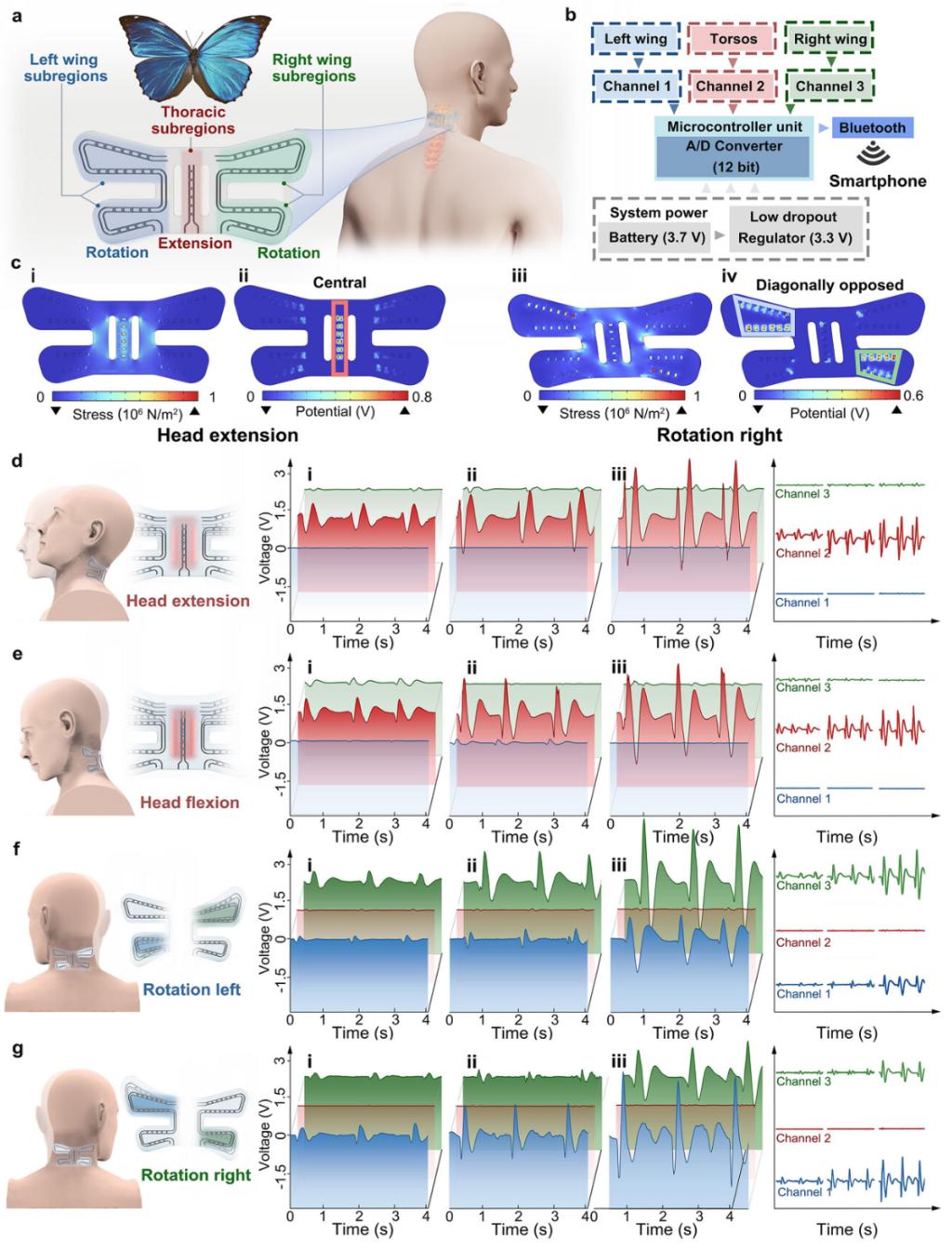 基于拓扑优化结果完成器件制备与实验验证,结果表明,在拉伸和扭转变形条件下,传感器灵敏度分别提升了59.2%和92.4%。结合多通道无线信号传输与分区结构设计,该传感器成功应用于人体颈部运动监测,能够精准识别运动模式与幅值,展示了其在可穿戴设备和运动监测领域的应用潜力。