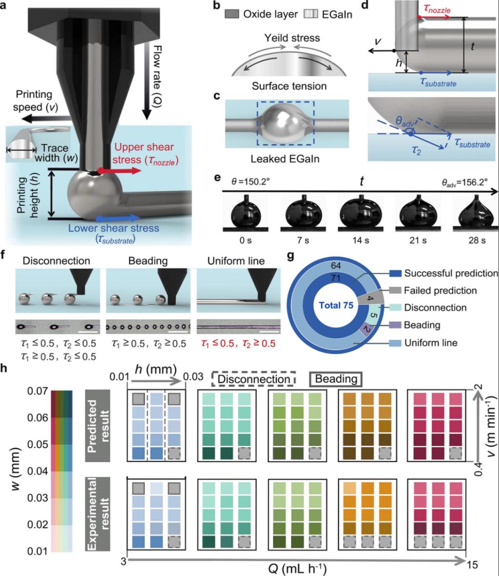 为本文的第一单位。该文提出拓扑优化设计应用于柔性压电传感器的新策略,有效解决了拉伸传感器在高形变与高信号转换效率之间的矛盾。借助计算机辅助拓扑优化工具,团队在多种变形模式下进行84次迭代,获得材料的最优空间分布设计。团队进一步发展了基于直写3D打印的液态金属线路制备方法,并建立了基于剪切力调控的打印机制,可实现对线路形貌、线宽及电阻的精准调控,打印形貌预测精度达到94.7%,最细打印精度可达40.4μm。