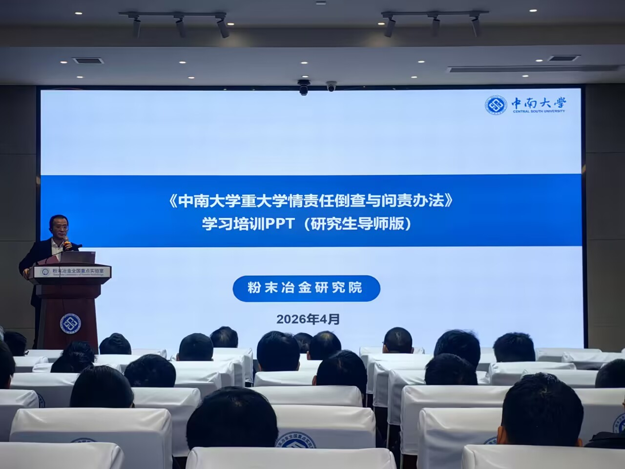 研究生培养整体情况,详细介绍了当前在读研究生总人数、博士生及硕士生导师队伍规模等信息。随后,他重点解读了2025-2026学年研究生招生工作进展,并结合现阶段研究生培养工作实际,深入分析了工作中存在的问题与不足,提出了针对性改进建议。刘彬副院长强调,导师是研究生培养的第一责任人,必须切实强化过程指导,紧盯学生学业进度,同时高度关注学生心理健康,筑牢学生心理安全防线。