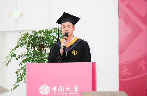 名单宣读完毕后,本科生代表王佳骏同学发言。他回顾在校四年的学习生活点滴,感恩与同学、老师共度的时光,感恩粉冶院给予的机会与平台,他说:“无论前往何方,无论身在何处,我一定会把粉冶精神牢牢放在心中,将在粉冶院学到的优秀品质坚持发扬。”