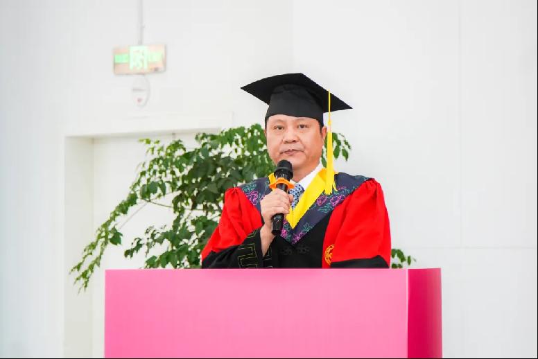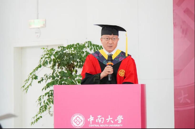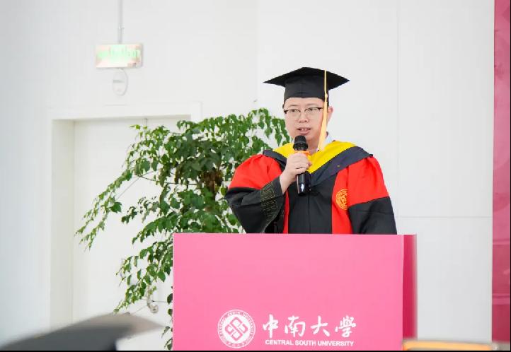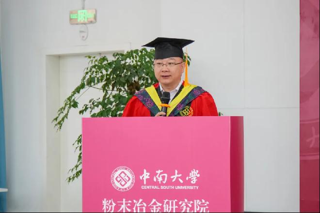 典礼接近尾声,张斗院长为毕业生致辞。他对毕业学生表达了诚挚的祝贺与祝福,骄傲地讲述了学生入学以来粉冶院取得的发展与成就。“尔我偏偏俱少年,飞扬意气生云烟。”张院长满怀豪气地勉励,他亲切嘱托着,“希望大家捂热科研的‘冷板凳’”,以热爱抵岁月漫长,不惧未知,不忘初心。
