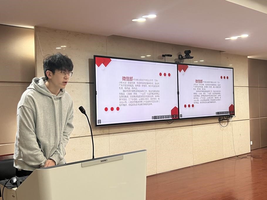 大会伊始,由新媒体中心主任于旻澍介绍各个部门的部长、副部长、指导老师贺林豪,以及各部门主要工作内容。此外,他也向加入新媒体中心的新干事们表示欢迎。