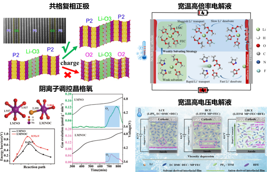 针对正极材料低温离子扩散动力学差、高温稳定性差、高电压不可逆相变及电解液低温离子电导率低、脱溶剂化慢、高温副反应多等问题,通过内应力调节构筑共格复相结构、阴离子调控、多元协同、竞争性配位等方法,提升正极材料结构稳定性、优化电解液溶剂化结构、构筑快离子传输通道的策略,突破-60℃~80℃的宽温域高性能电池材料与器件。