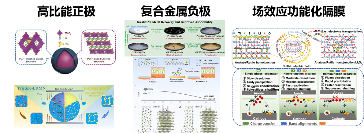 围绕高能量密度的迫切需求,基于复相共格结构构筑、表面化学激活、人工界面构筑、场效应耦合等策略,在正极材料、金属负极及隔膜等方面展开系统研究,实现了高比能正极材料高界面稳定性、金属负极高稳定性、功能化隔膜高可靠性等,其中富锂锰基正极材料已经实现了成果转化应用。